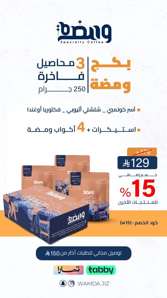 • المحتويات: آسر كولومبي – 250 جرام، شلشلي إثيوبي – 250 جرام، فيكتوريا أوغندي – 250 جرام